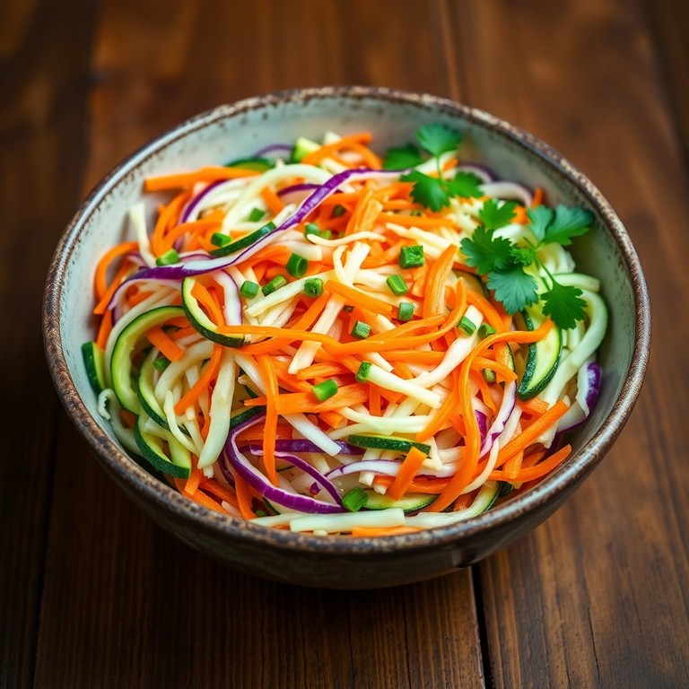 Uma salada fresca e crocante, perfeita para acompanhar qualquer refeição. A combinação de cenoura, repolho e abobrinha traz uma explosão de cores e sabores, além de ser muito nutritiva.