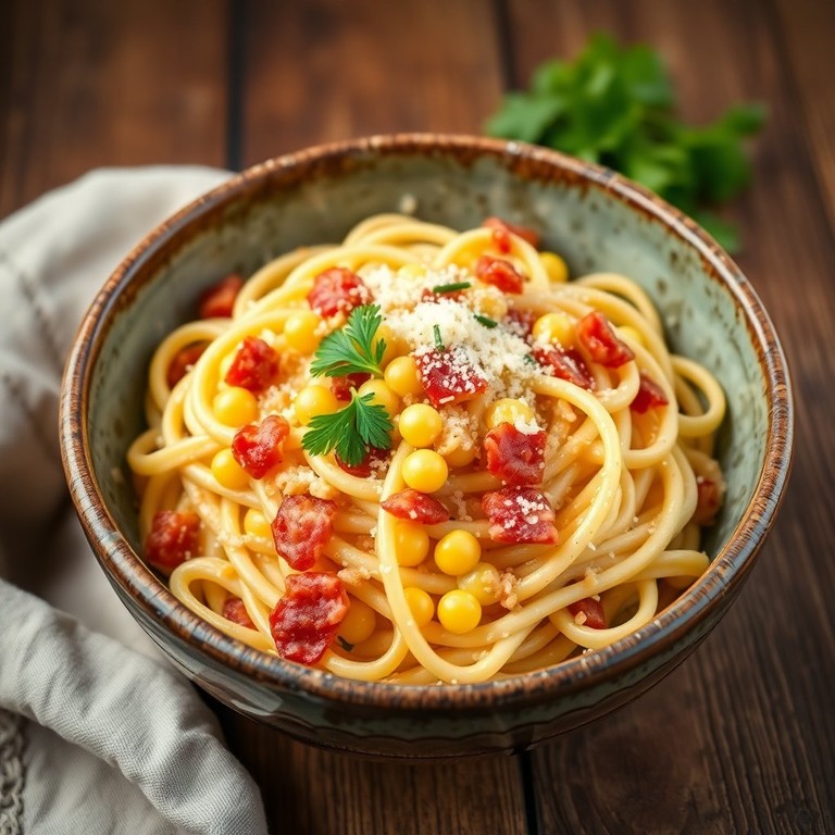 Um prato de macarrão cremoso, rico em sabor, com bacon crocante e milho doce, perfeito para um almoço ou jantar aconchegante.