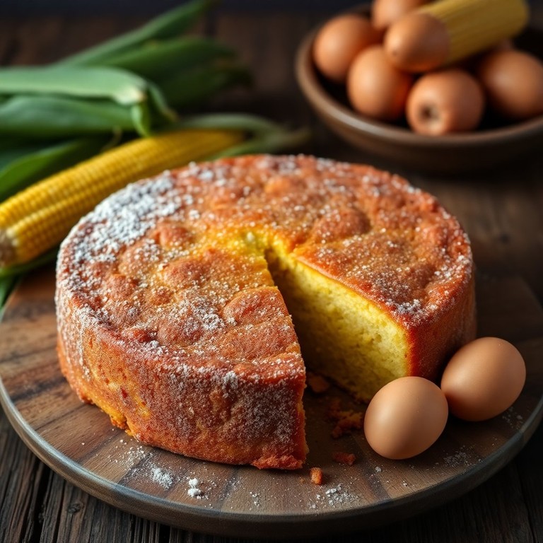 Um bolo de milho úmido e saboroso, feito com farinha de milho, banha de porco e ovos, perfeito para acompanhar um café da tarde.
