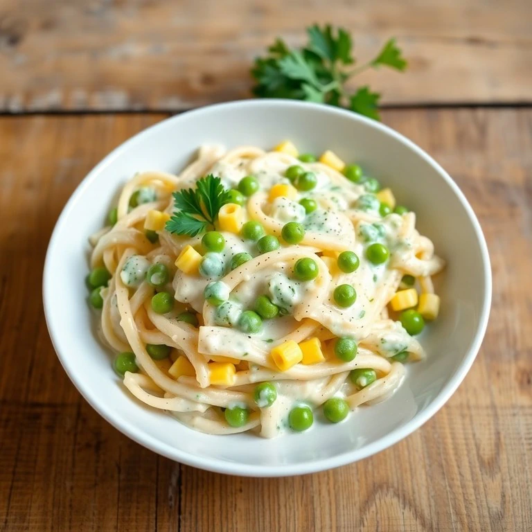 Macarrão ao Molho Branco com Ervilhas e Milho Cremoso
