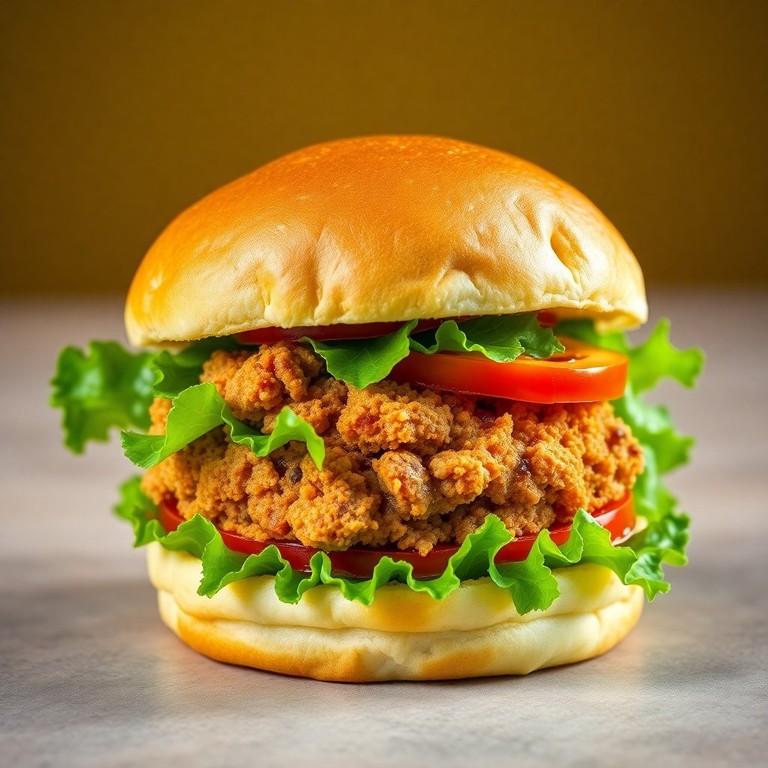 Uma explosão de sabores com um toque crocante, este hambúrguer combina o suculento guisado de frango com uma crosta crocante de fubá, perfeito para um lanche ou refeição especial.
