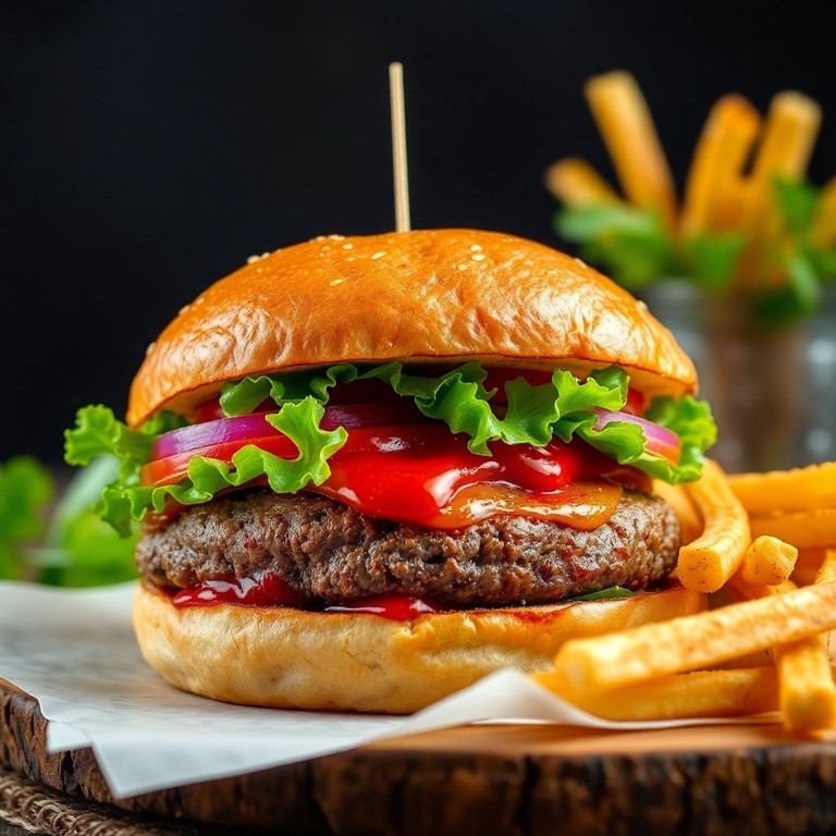 Este sanduíche de hambúrguer combina o sabor suculento da carne com a crocância da chicória e o frescor do ketchup caseiro, proporcionando uma experiência única e deliciosa a cada mordida.