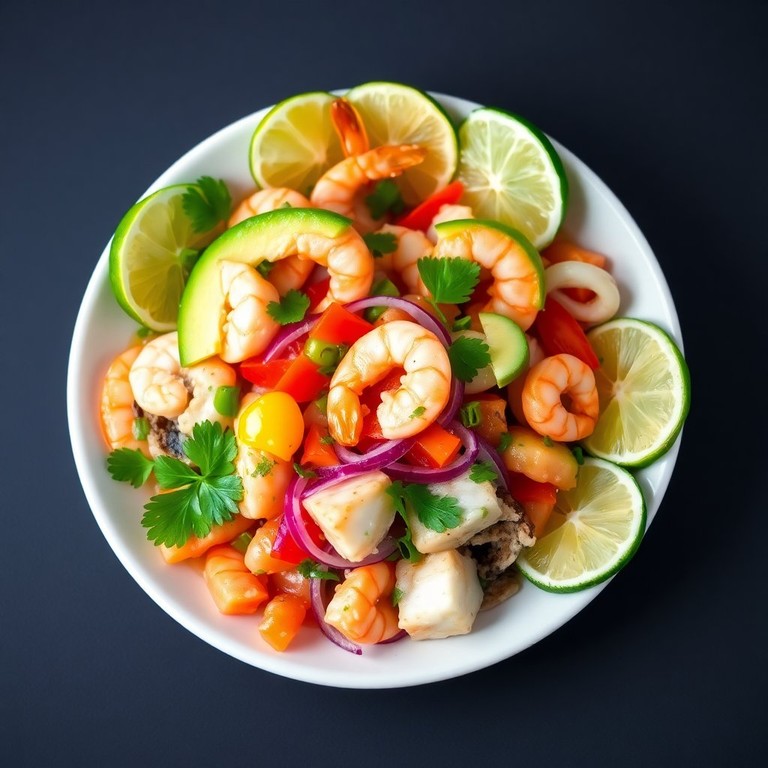 Este ceviche mixto es una deliciosa combinación de mariscos frescos y hierbas aromáticas, ideal para disfrutar en un día caluroso. La acidez del jugo de limón y naranja realza los sabores del mar, mientras que el aguacate aporta cremosidad. Perfecto como aperitivo o plato principal.