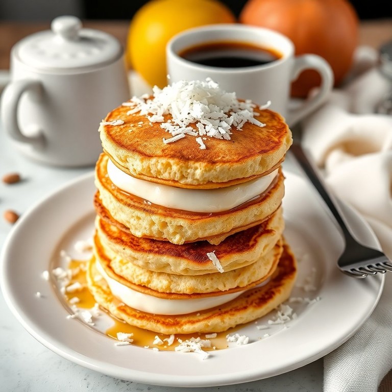 Deliciosas panquecas leves e doces, perfeitas para o café da manhã, recheadas com leite condensado cremoso e cobertas com coco ralado.