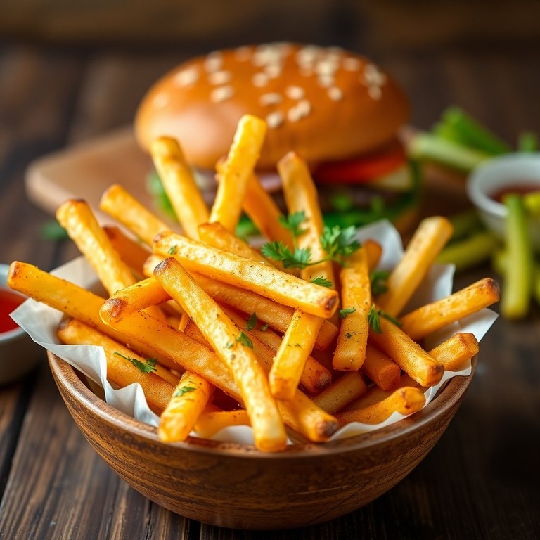 Estas papas fritas crujientes son el acompañamiento perfecto para cualquier hamburguesa. Sazonadas con una mezcla de especias, son irresistiblemente sabrosas y crujientes.