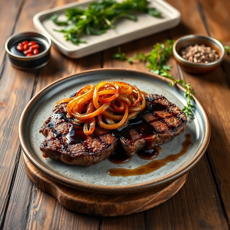 Bife Grelhado com Cebola Caramelizada e Molho Shoyu