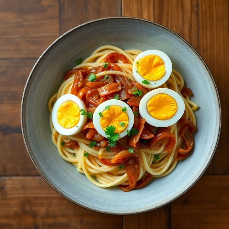 Um prato reconfortante com macarrão cremoso, cebola caramelizada e ovo cozido.