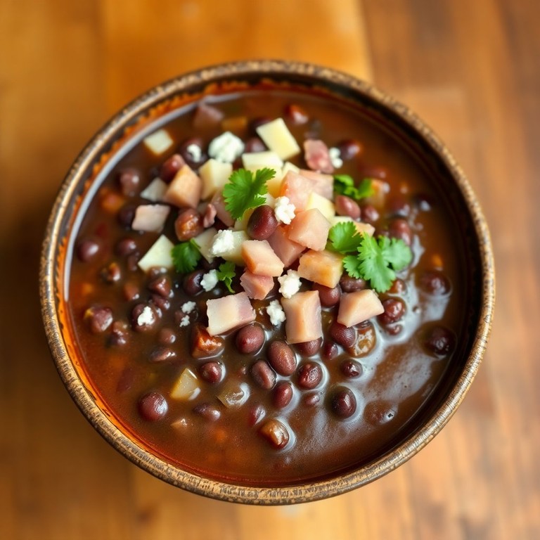 Una reconfortante sopa de frijoles negros, enriquecida con queso y trocitos de jamón, perfecta para los días fríos.