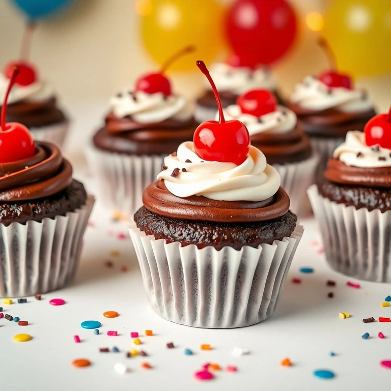 Deliciosos cupcakes de chocolate com uma cobertura leve de chantilly e decorados com cerejas, ideais para celebrar seu aniversário com muito sabor e alegria.