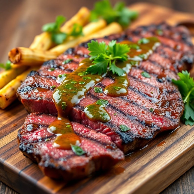 Uma deliciosa picanha grelhada, suculenta e temperada, acompanhada de um molho chimichurri vibrante que realça o sabor da carne. Ideal para um churrasco com amigos e família.