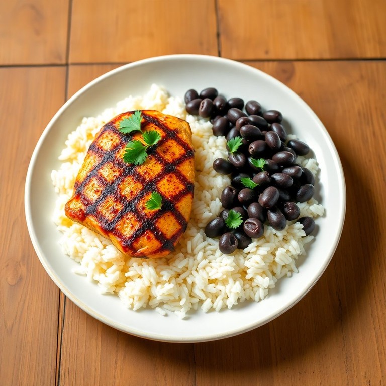 Uma combinação saudável e deliciosa para o seu almoço, com peito de frango grelhado, arroz soltinho e feijão preto nutritivo.