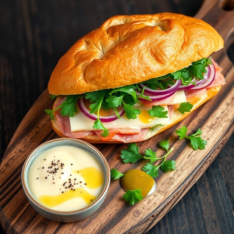 Uma versão sofisticada do tradicional lanche brasileiro, o Pão com Mortadela Gourmet combina a suculência da mortadela com o sabor intenso do queijo provolone e a frescura da rúcula, tudo isso em um pão crocante e aromático.