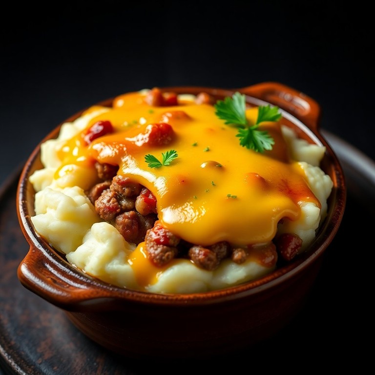 Um prato reconfortante com carne moída e um cremoso purê de batata com cheddar.