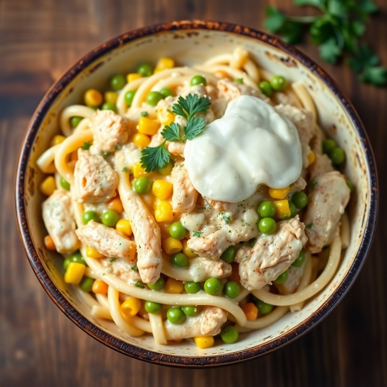 Um prato reconfortante de macarrão com frango, milho e ervilha em um molho cremoso, perfeito para um almoço em família ou um jantar especial.