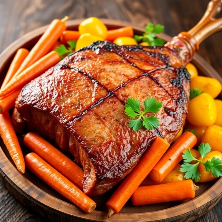 Uma deliciosa combinação de sabores assados ao forno, onde a picanha suína se destaca com seu tempero especial, acompanhada de batatas e cenouras macias e saborosas.
