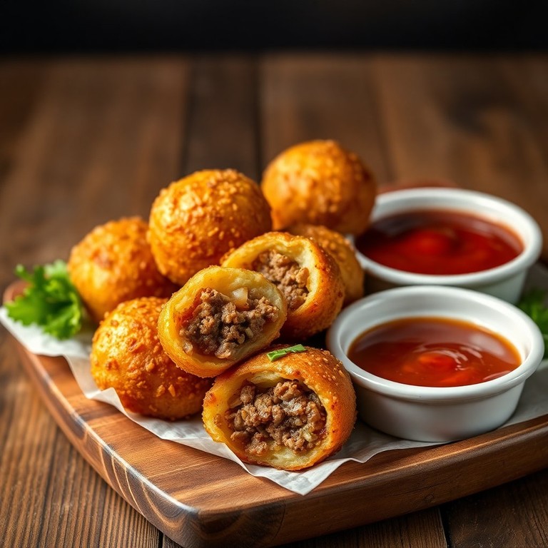 Deliciosos bolinhos fritos recheados com carne moída e cebola caramelizada, perfeitos para um lanche ou entrada.