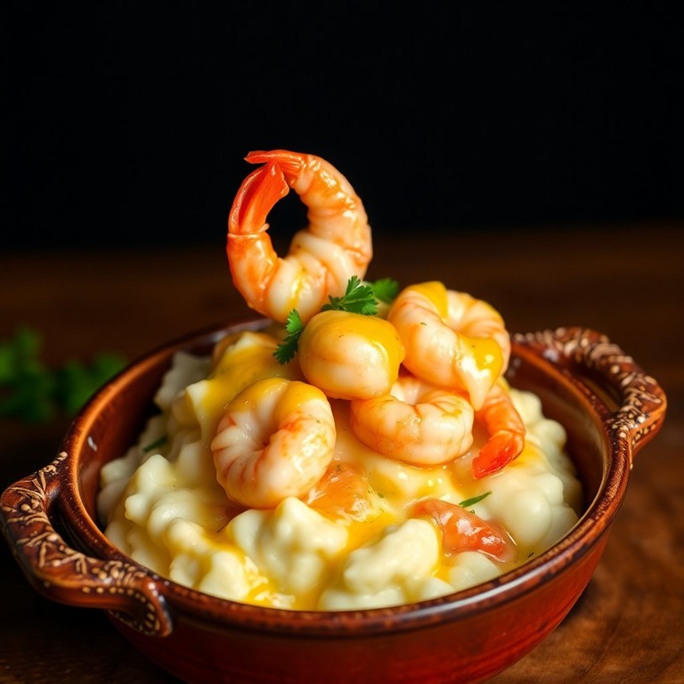 Uma deliciosa camada de purê de batata e camarões cremosos, perfeita para impressionar.