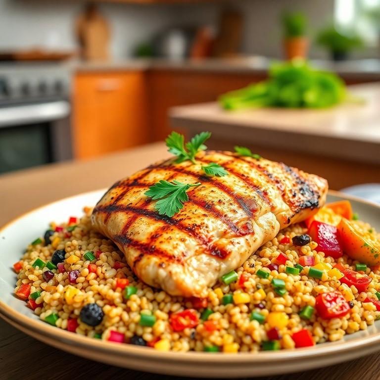 Uma refeição rica em proteínas e nutrientes, perfeita para quem busca ganhar massa muscular. O frango grelhado combina perfeitamente com a quinoa e os legumes coloridos, criando um prato saudável e saboroso.