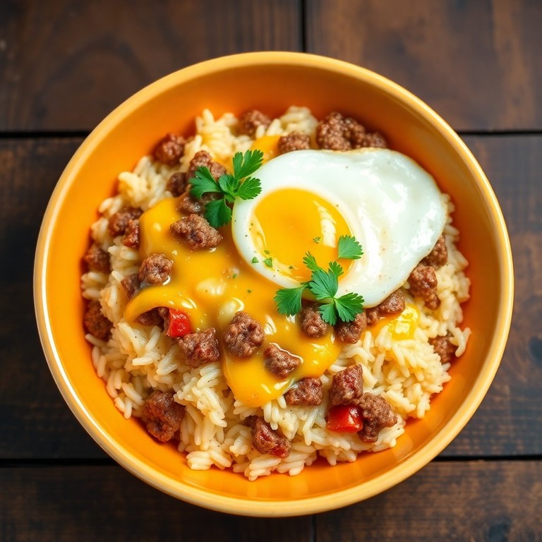 Uma mistura cremosa de arroz, queijo, pedaços de hambúrguer e ovo mexido, ideal para um almoço rápido.