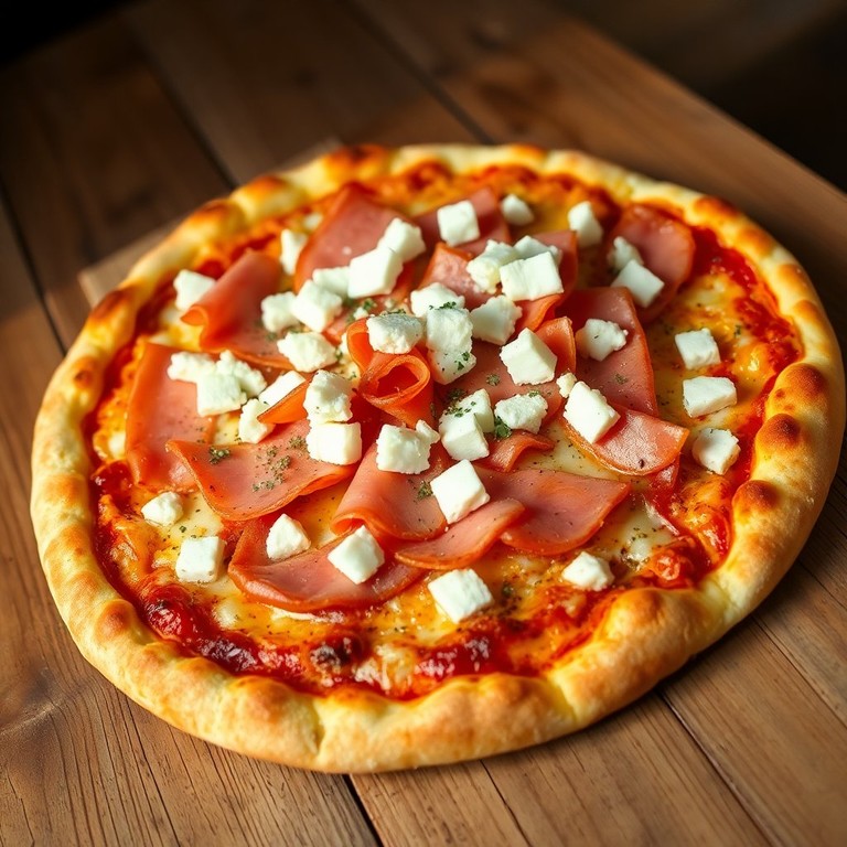 Uma deliciosa pizza com camadas de presunto, mussarela e queijo fresco, perfeita para qualquer ocasião.
