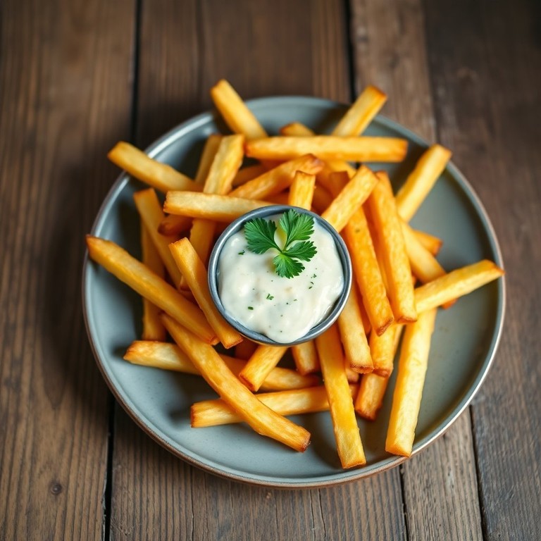 Batatas fritas irresistíveis, acompanhadas de um molho cremoso e saboroso.