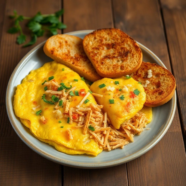 Uma omelete leve e saborosa, feita com kani desfiado e acompanhada de pão torrado crocante, perfeita para um café da manhã ou lanche.