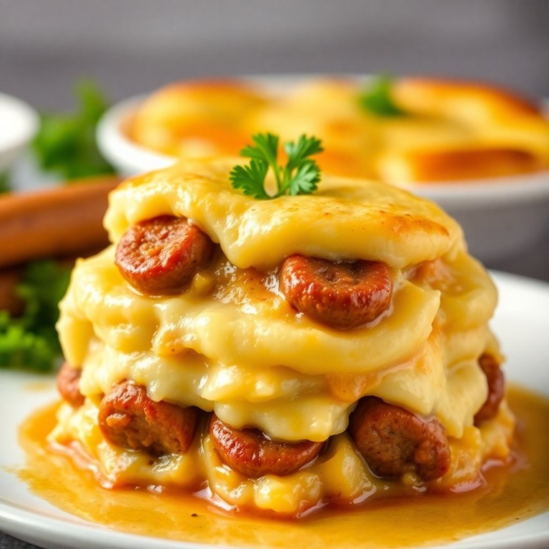 Um prato reconfortante com purê de batata e calabresa, assado até dourar.
