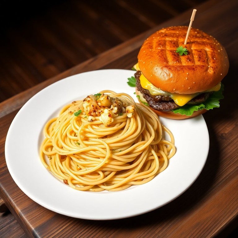 Uma receita clássica de macarrão ao alho e óleo, servida com um hambúrguer grelhado suculento. Perfeita para um jantar rápido e saboroso!