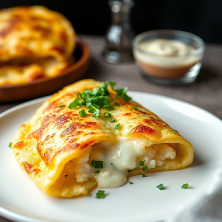 Uma omelete leve e nutritiva, combinando flocão de arroz e queijo derretido, perfeita para um café da manhã saudável ou um lanche.