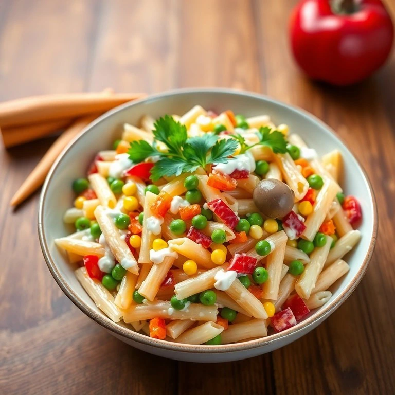 Uma salada de macarrão refrescante, misturada com maionese e uma variedade de legumes, ideal para um almoço leve.