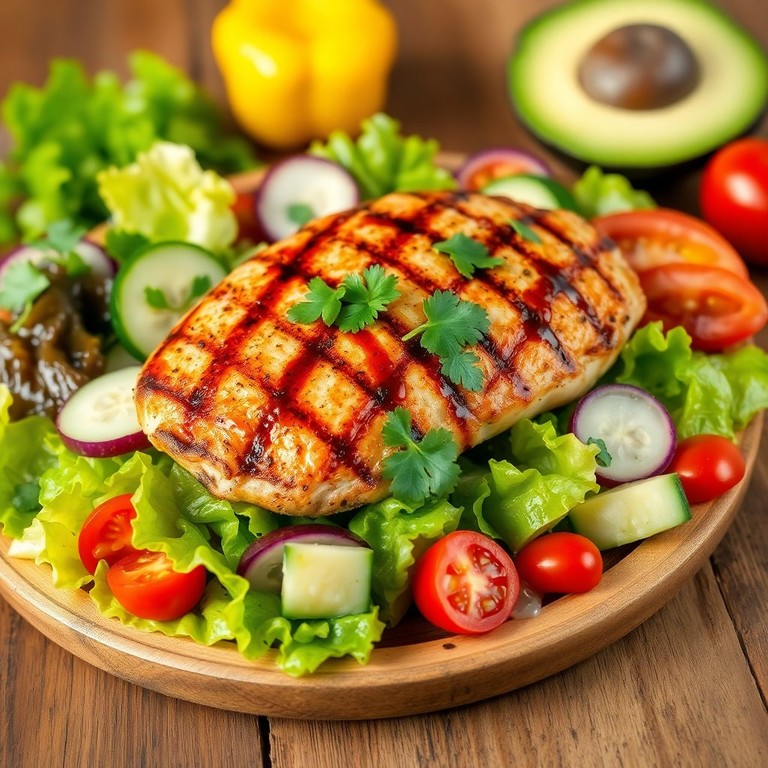 Disfruta de un delicioso pollo marinado a la parrilla acompañado de una ensalada crujiente de vegetales de temporada.