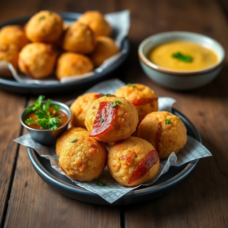 Petiscos saborosos e crocantes, ideais para um lanche ou aperitivo. Esses bolinhos são recheados com calabresa e bacon, proporcionando um sabor irresistível e uma textura crocante por fora e macia por dentro.