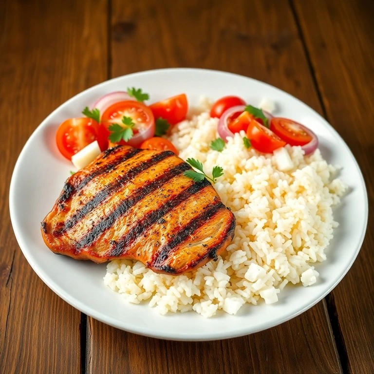 Um prato leve e nutritivo, perfeito para qualquer ocasião! O frango grelhado é suculento e temperado, acompanhado de arroz parboilizado e uma refrescante salada de tomate e cebola.