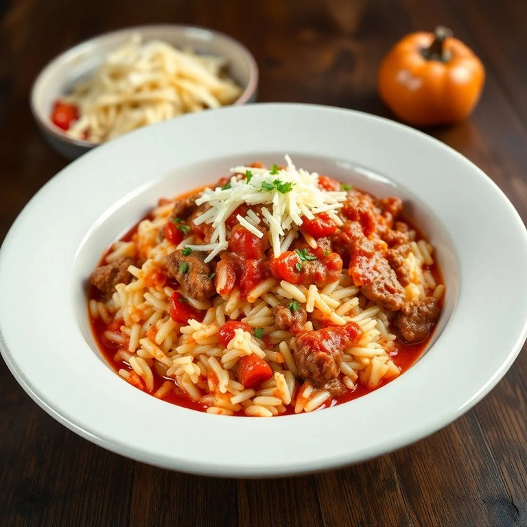 Um prato reconfortante e saboroso, onde o arroz se une à carne moída e a um molho de tomate irresistível.