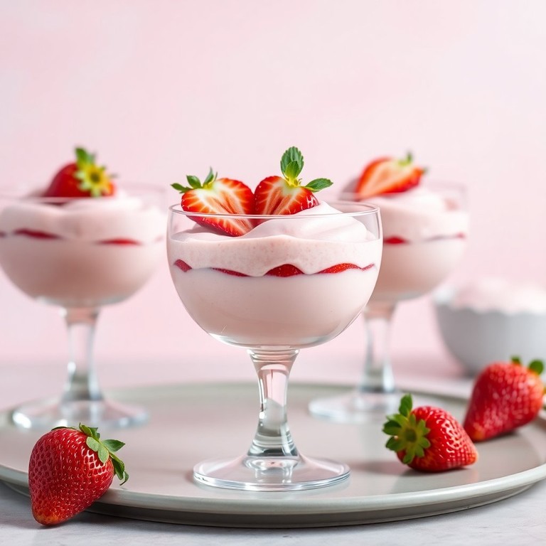 Um mousse cremoso e aerado, realçado pelo sabor doce do morango e a leveza da gelatina. Perfeito para sobremesas especiais!