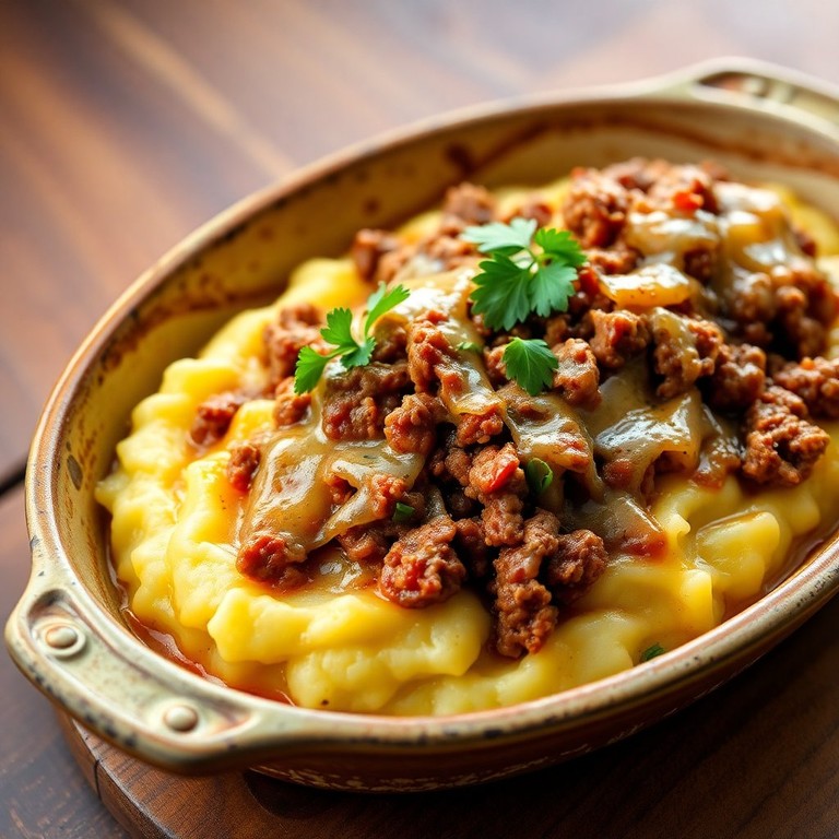 Um purê cremoso de batata coberto com uma deliciosa carne moída e queijo derretido por cima, perfeito para um almoço reconfortante.