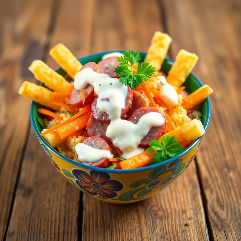 Uma salada refrescante que combina a crocância da batata palha com o sabor da linguiça, perfeita para acompanhar churrascos ou como um prato leve e saboroso.