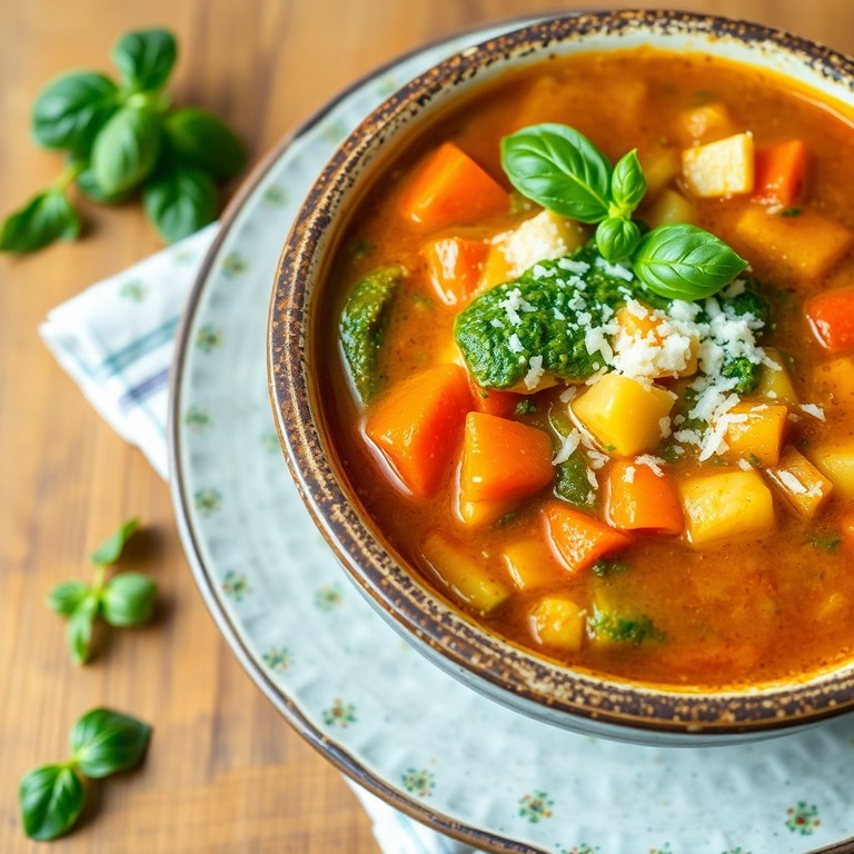 Un twist savoureux avec du pesto frais, pour une touche italienne authentique. Cette soupe minestrone est un mélange de légumes colorés, de haricots et de pâtes, rehaussé par l'ajout de pesto frais qui lui confère une saveur unique et délicieuse.