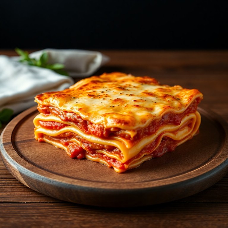 Uma deliciosa lasanha feita com camadas de macarrão, queijo e um saboroso molho de tomate.