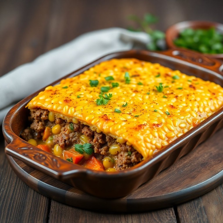Un delicioso pastel de choclo con carne y un toque de especias, perfecto para compartir con grandes grupos.