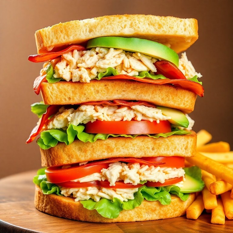 Un delicioso sándwich club clásico que combina pollo tierno, tocino crujiente y vegetales frescos, ideal para un almuerzo sustancioso.