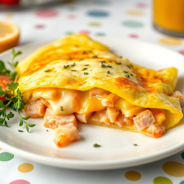 Uma omelete fofa e nutritiva, perfeita para o café da manhã, recheada com presunto, queijo e um toque especial de orégano.
