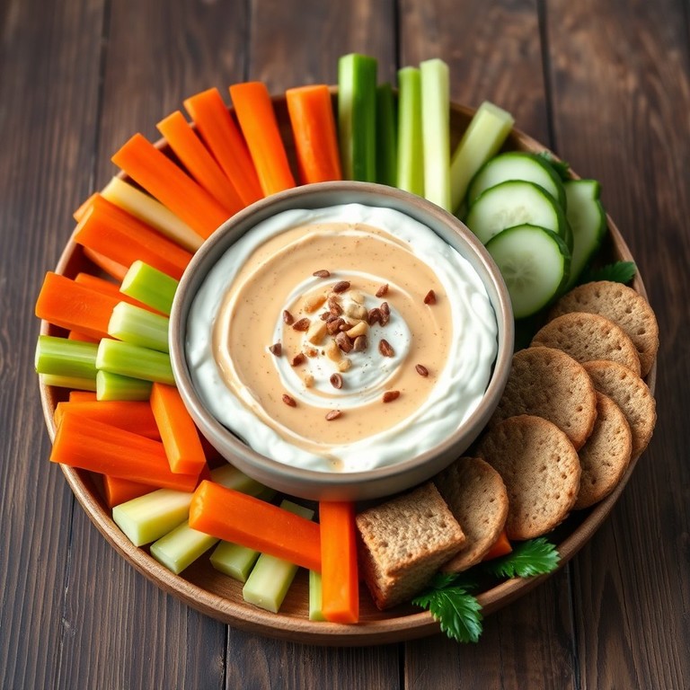 Un dip cremoso y nutritivo que combina el yogur griego y la mantequilla de maní, ideal para disfrutar con verduras frescas o galletas. Perfecto como un snack saludable.