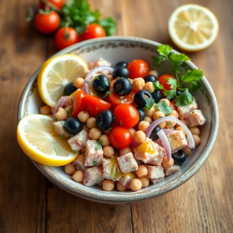 Una colorida ensalada con atún, garbanzos, aceitunas y un aderezo de limón, ideal para un almuerzo ligero y nutritivo.