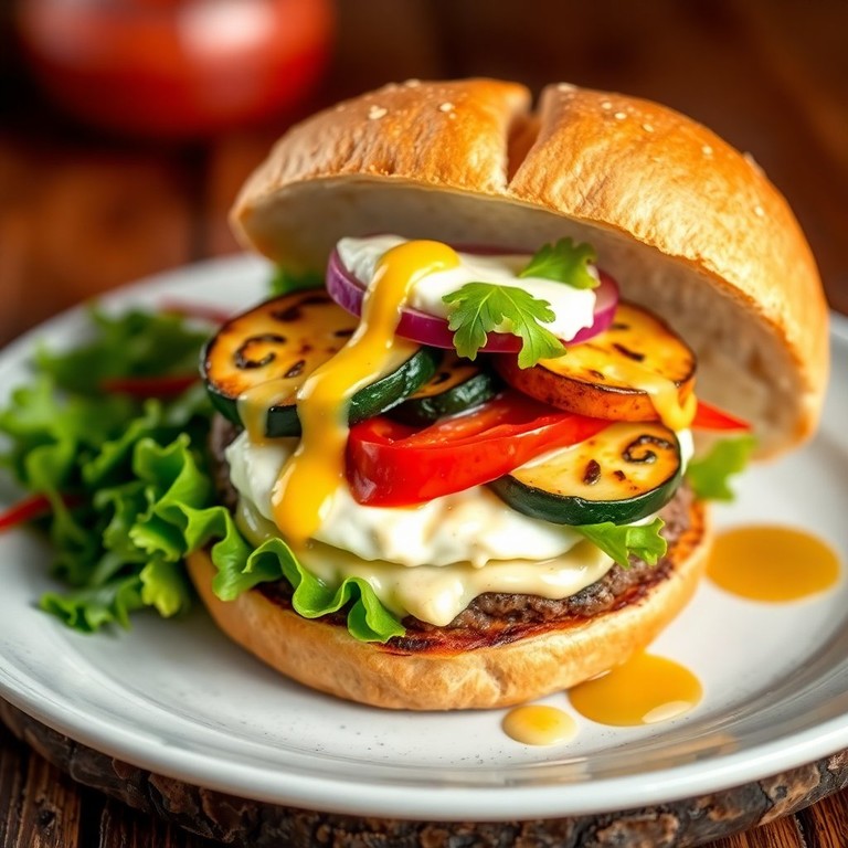 Savourez un mélange de saveurs avec du fromage de chèvre crémeux et des légumes grillés dans ce burger gourmet irrésistible.