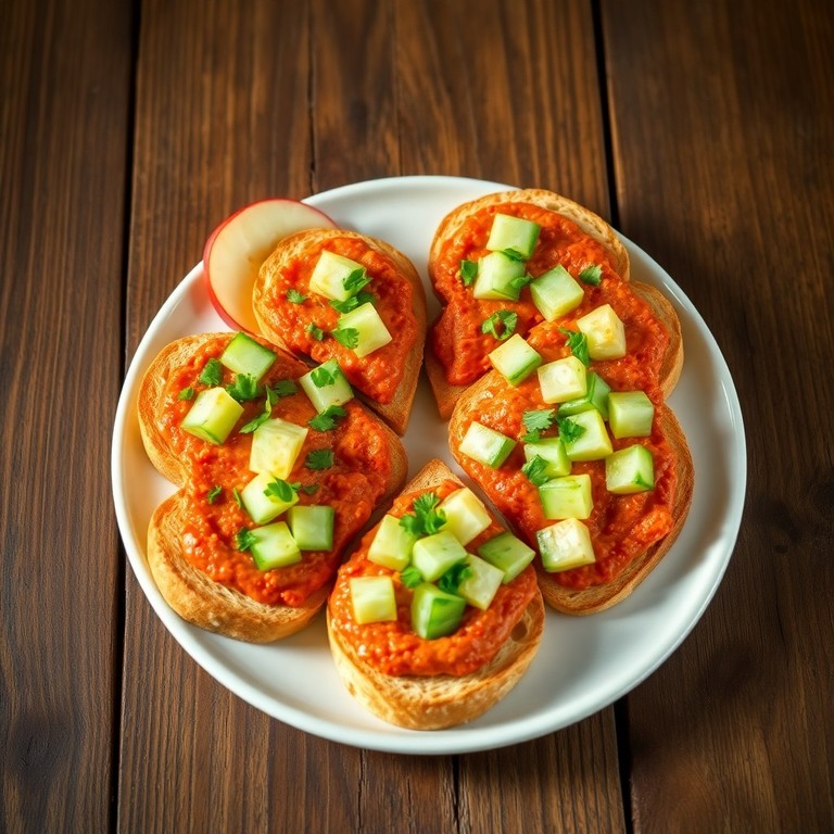 Deliciosas tostadas de pan de molde con un hummus cremoso de pimiento, cebolla y pepino, perfectas para un desayuno nutritivo y colorido. ¡Listas en menos de 20 minutos!