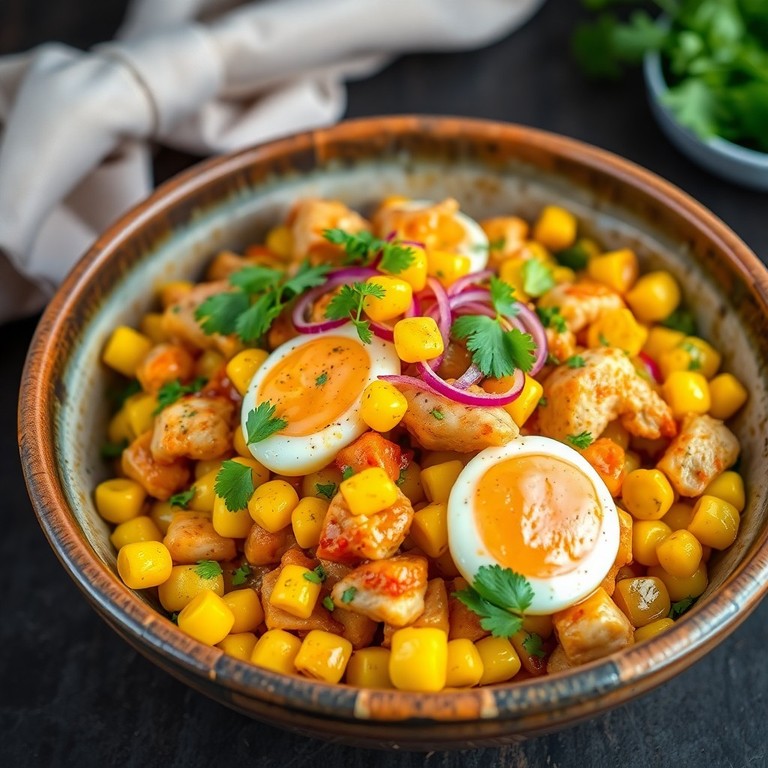 Un delicioso salteado peruano que combina pollo, choclo y huevo, aderezado con especias tradicionales, listo en solo 30 minutos.