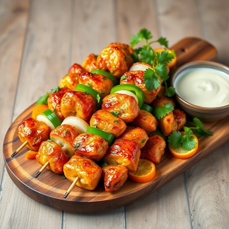 Brochetas de pollo marinado en crema de coco y especias, intercaladas con vegetales frescos y asadas a la perfección para una explosión de sabor tropical.