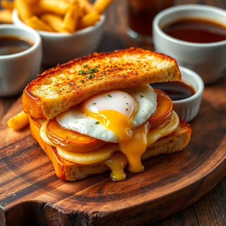 Um sanduíche quente e reconfortante, perfeito para um lanche rápido! Pão de forma tostado com camadas de queijo derretido, banana caramelizada, ovo frito e um toque de goma de tapioca para uma textura única. Uma explosão de sabores em cada mordida.