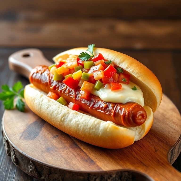 Cachorro-quente incrementado com purê de batata cremoso, salsicha de frango e vinagrete refrescante. Uma opção econômica e deliciosa para o dia a dia.